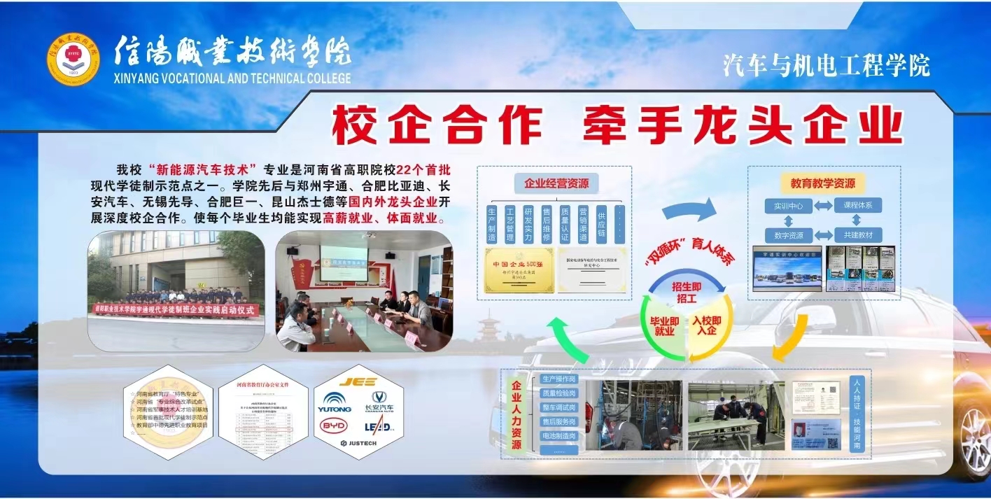 我校“新能源汽车技术”专业是河南省高职院校22个首批现代学徒制示范点之一,成功申报河南省现场工程师专项培养计划项目。我们牵手郑州宇通、理想汽车、比亚迪、无锡先导、江苏杰士德、欣旺达、博众精工开展订单班、冠名班。实施“把企业生产资源转化为教育教学资源,把教育教学资源转化为企业人力资源,再把人力资源转化为企业生产资源”,真正实现学生“入学即入职、学习即上岗、毕业即就业”校企深度融合,努力打造具有信职特色的产业学院。