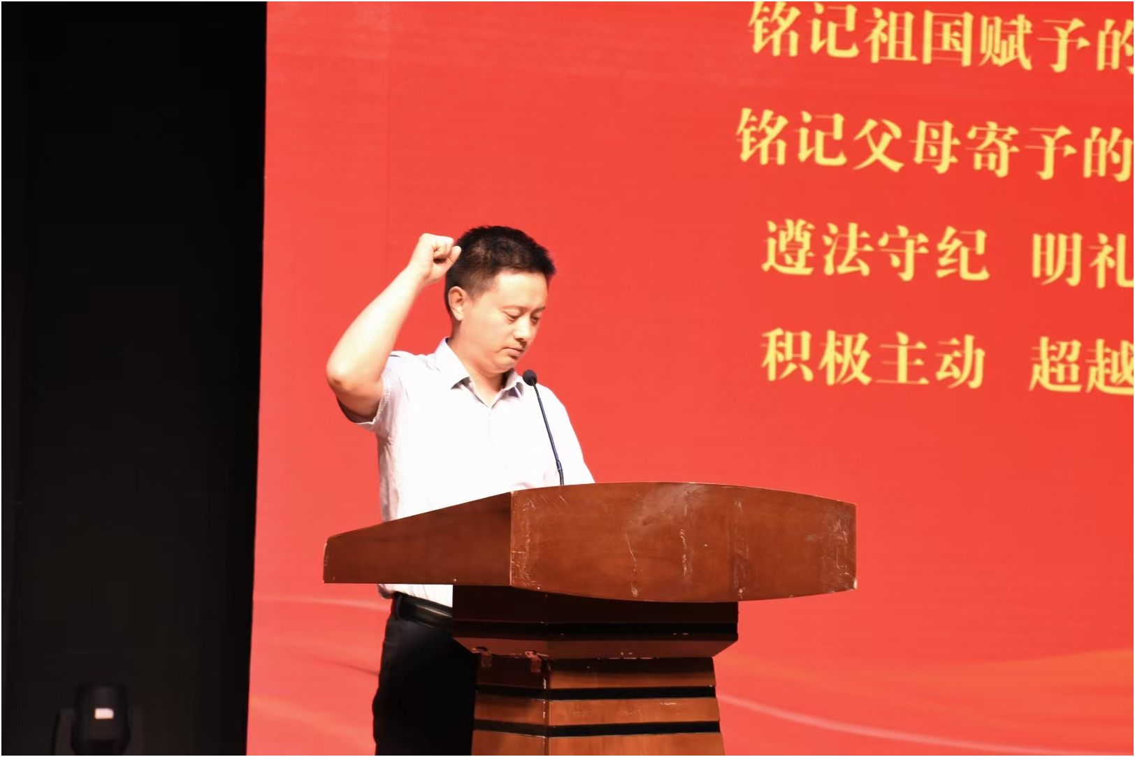 最后全体新生在团总支书记李明的带领下宣誓新生入学誓词。宣誓声音整齐洪亮,响彻整个图书馆报告厅。