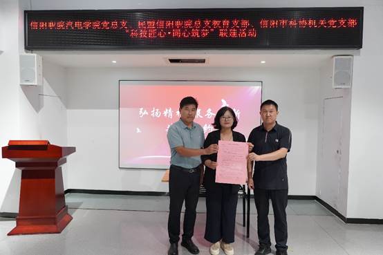 活动的高潮是深化共建合作环节。朱燕鸣现场宣读了《“弘扬精神 服务创新”共建倡议书》,倡议书聚焦“党建引领、统战聚力”的核心,呼吁各方在科普教育资源共享、技术技能推广、创新人才培养、服务地方发展等方面加强深度合作,汇聚智慧与力量,共同服务区域科技创新与产业升级。活动现场,三方单位代表(汽电学院党总支、民盟信阳职业技术学院总支教育支部、信阳市科学技术协会机关支部)共同签署了该倡议书,标志着多方合作平台的正式建立与未来合作的广阔前景。